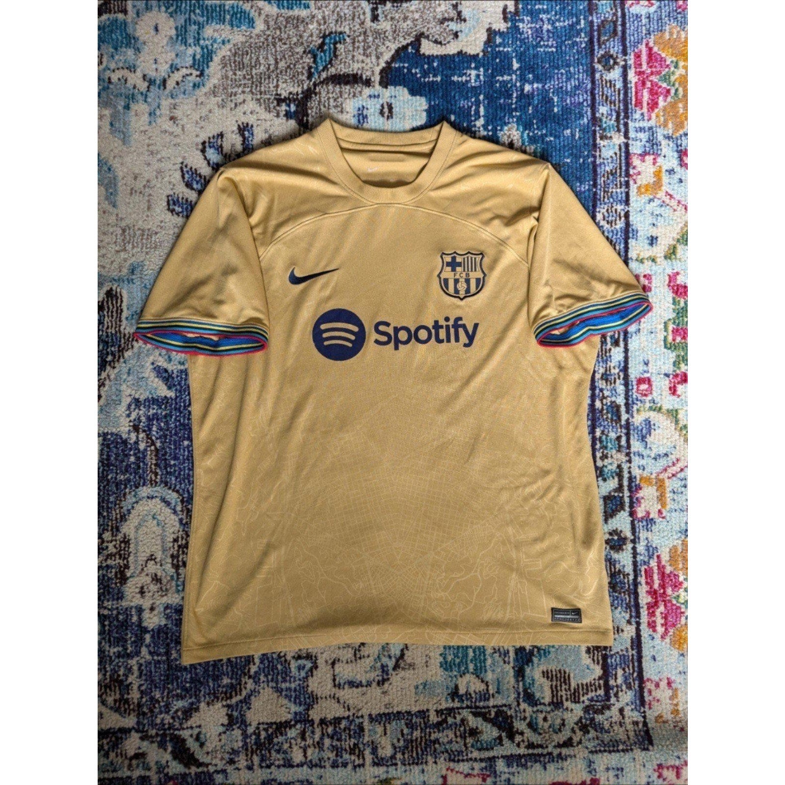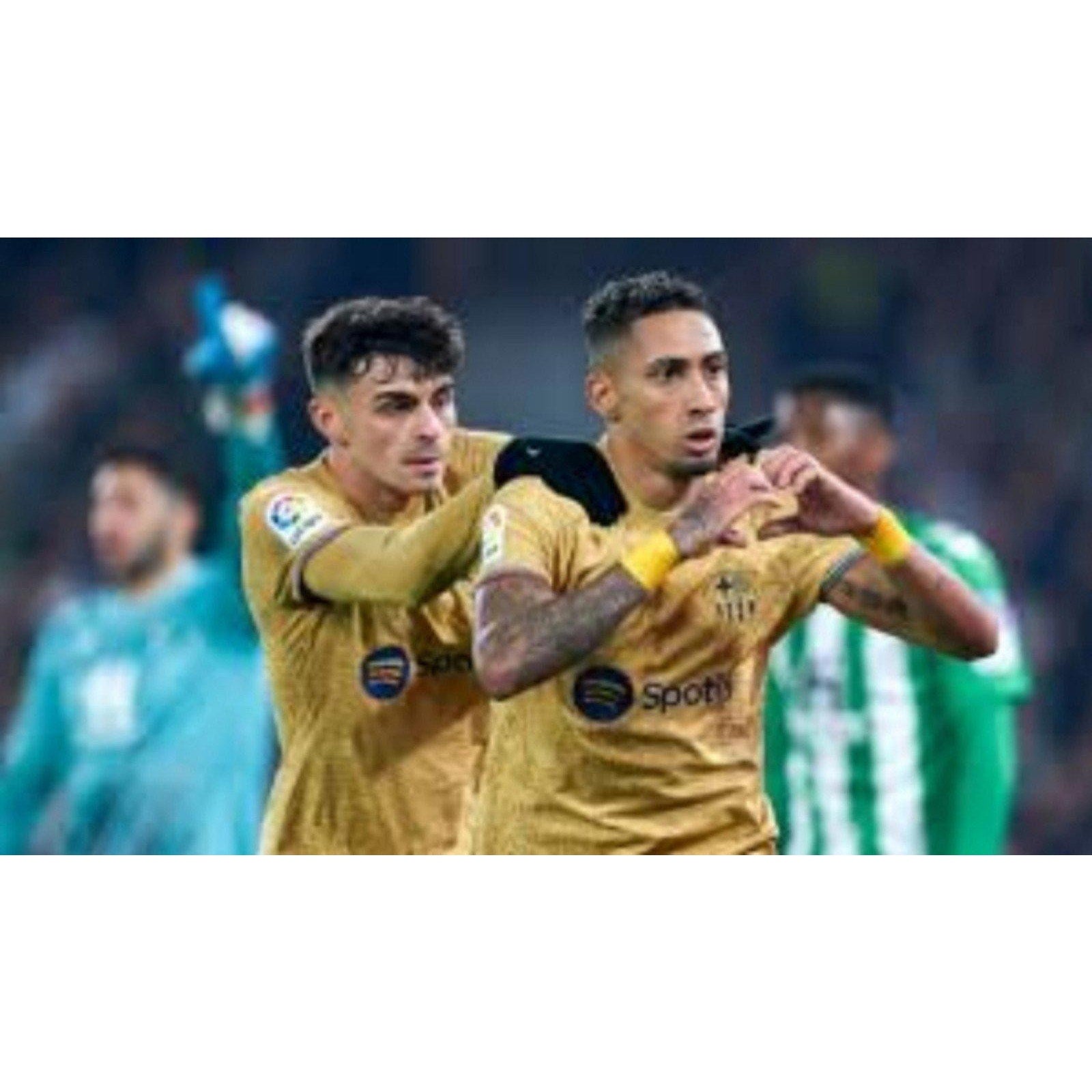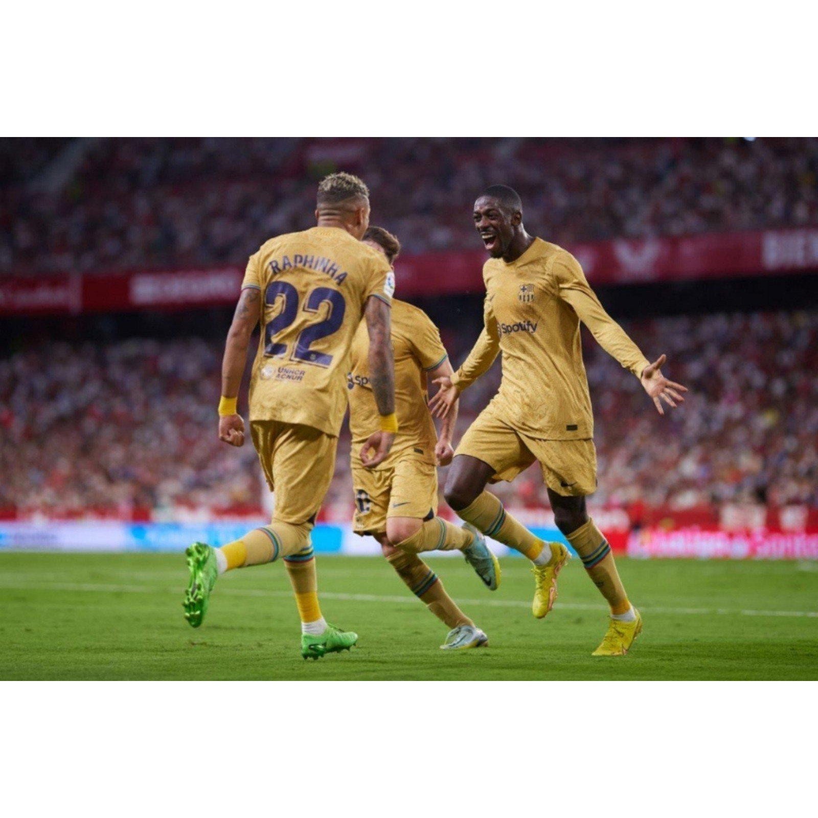 Stand out like a true Barça fan with the 2022/23 FC Barcelona Away Raphinha Soccer Jersey, a masterpiece that captures the club's innovative spirit and Raphinha’s electrifying style of play. Featuring a sleek gold design inspired by the club's golden history, this jersey is accented with bold Blaugrana stripes and the iconic Barcelona crest. From his debut season with Raphinha’s name and number 22 on the back, it pays tribute to his dazzling footwork and game-changing performances. Light up the pitch and showcase your passion with this stunning Barça away kit!