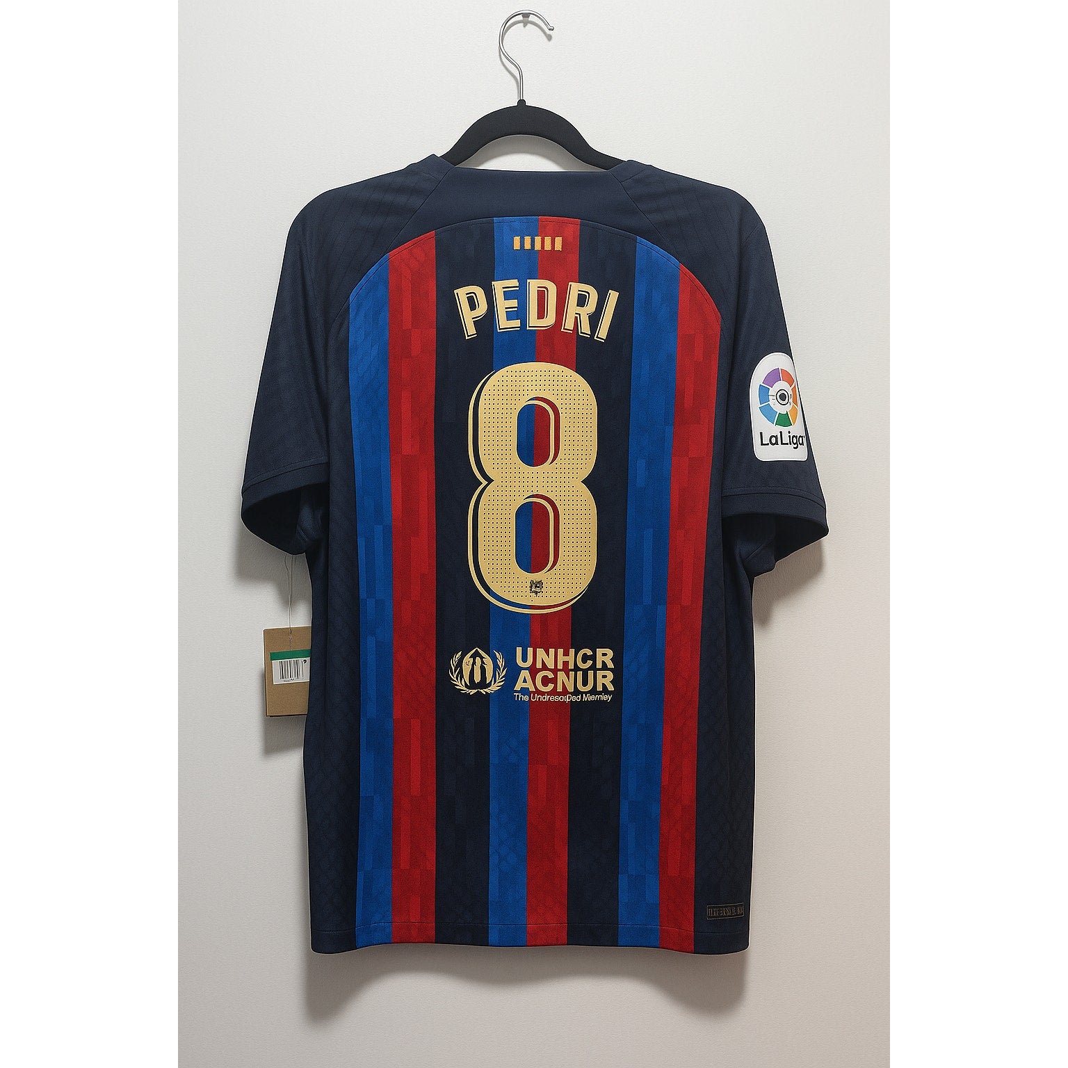 Experience the pride of the Camp Nou with this FC Barcelona 2022-23 Home Pedri #8 Nike ADV Player Version Jersey (Men’s XL, NWT) — the exact model worn by the team’s rising superstar on the pitch. Built with Nike’s ADV technology for elite performance, this authentic player-issue kit features the rich blaugrana stripes, bold Spotify sponsor, La Liga patch, and Pedri’s gold name and number — symbolizing the next generation of Barça greatness. With the official UNHCR/ACNUR badge, this jersey not only represents footballing excellence but also compassion and global unity.